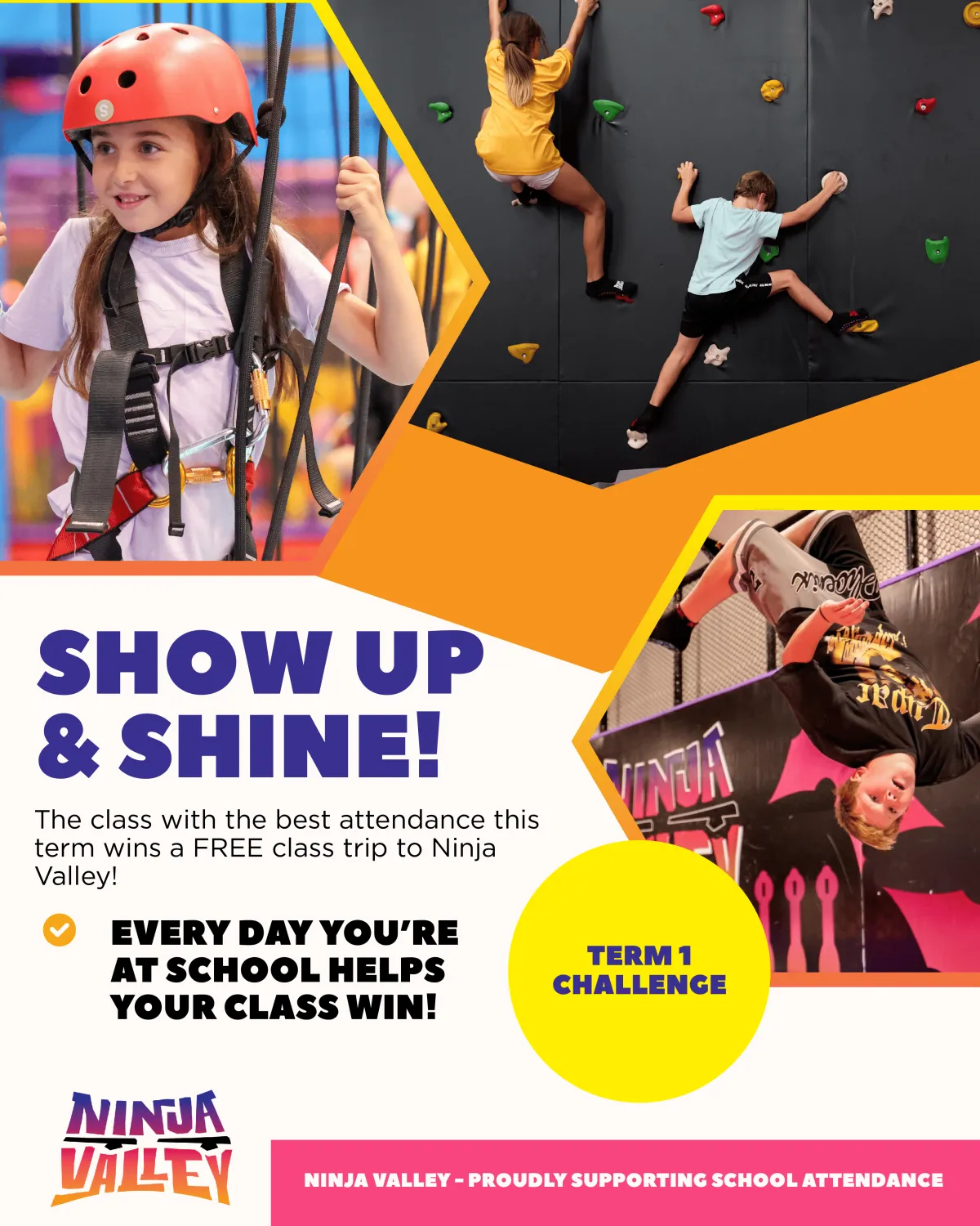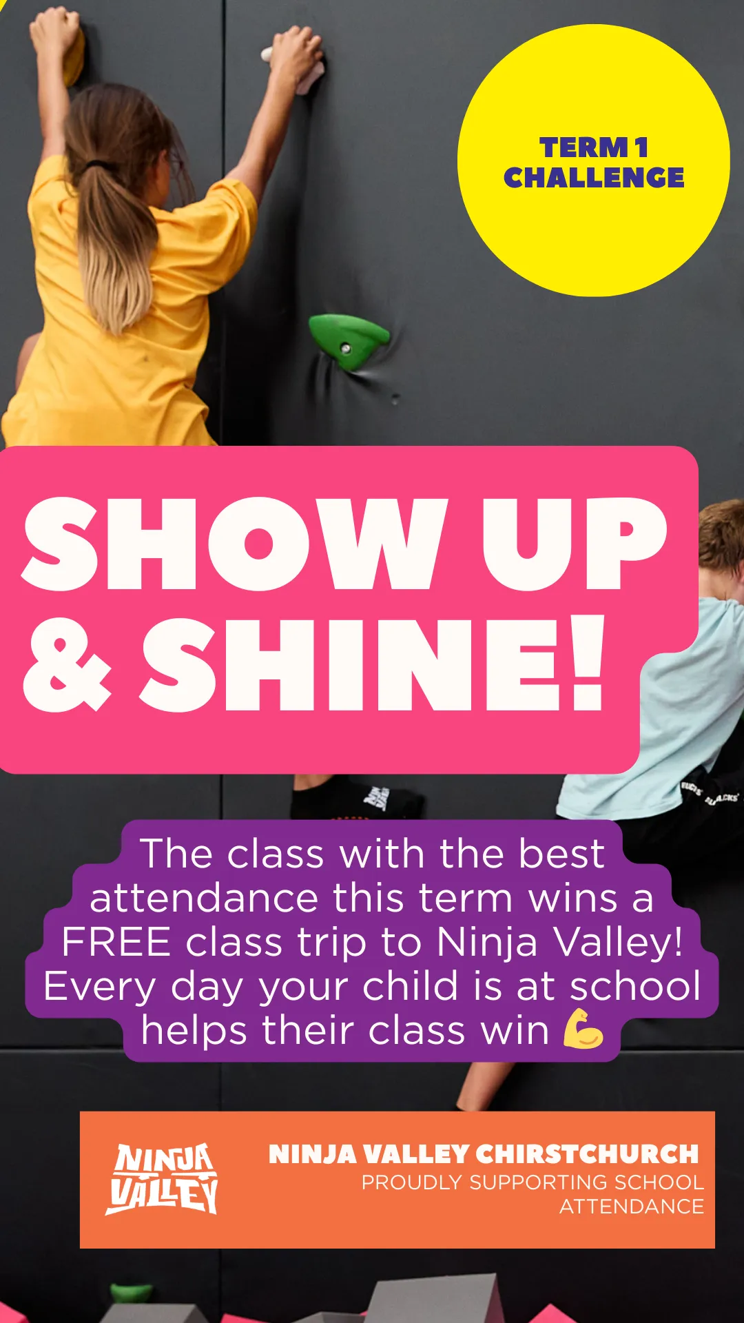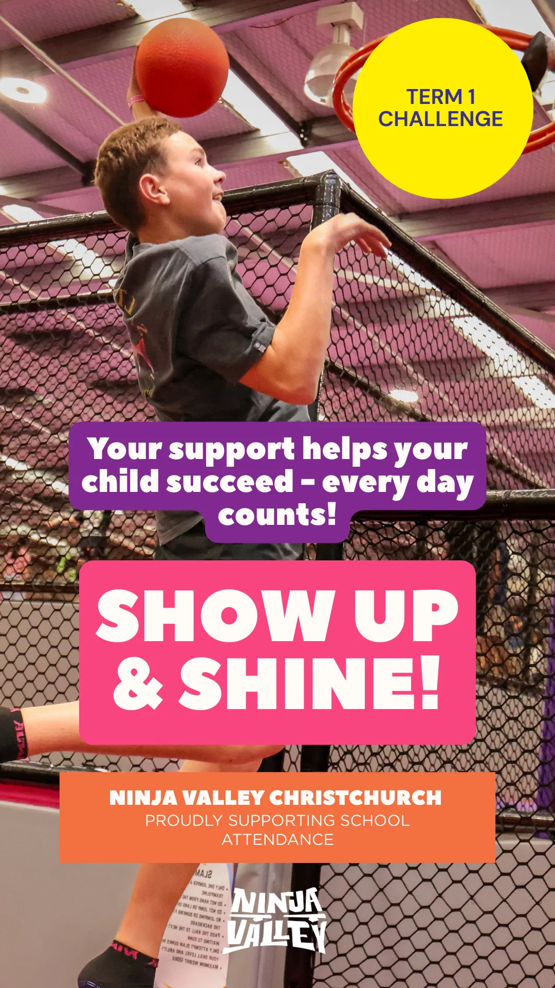 School attendance continues to be a significant challenge across Aotearoa. Ninja Valley's Show Up & Shine initiative is designed to boost attendance across the Waikato and Canterbury by gifting every participating school (Year 1-8) a free class trip to Ninja Valley. We believe we can play a positive role by using our platform and community reach to encourage students to show up, participate, and shine - every day.